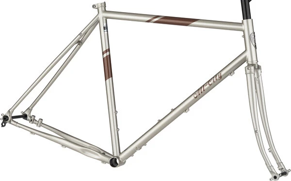 – Signature custom-cast dropout with replaceable derailleur hanger, signature lugged fork crown and custom fork ends, integrated seat collar, pantographed bottom bracket shell, reinforced bottle bosses for three bottle cages