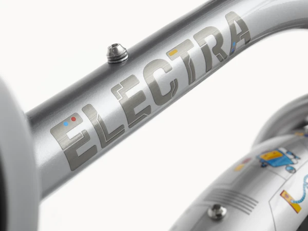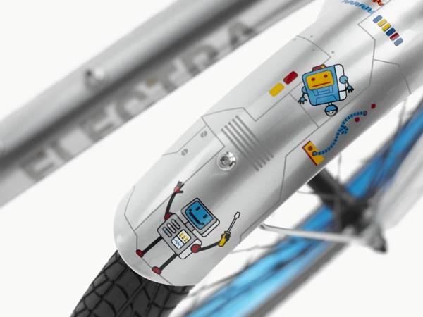 EBC 3000 20″ takes kids on a ride into the future. Robots wave “hello” as they busily tinker with the circuit board throughout the Space Dust frame, fenders and chainguard. Futuristic elements are carried throughout the custom debossed saddle and friendly robot bell.