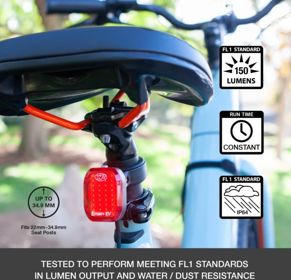 Emax+ 150 is NiteRider’s first taillight specifically made for electric bikes. It comes with a power line that’s pre-wired for connection to the eBike’s battery. Power line cable measures approximately 52″ in length. Taillight powers ON with ignition/ power switch. Features six modes-Steady ON and varying flashes-with Built-in Mode Memory (remembers last setting).