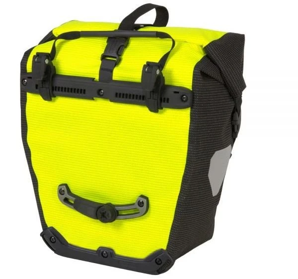 A brilliant idea for all-season, all-weather riders: the bike bags in the Ortlieb High Visibility Line make it easier for other people to see you while you’re out there on the streets. This is because all High Visibility bags not only come with reflectors, but are themselves one big reflector. The waterproof bags are made with a polyurethane-coated Cordura fabric that is woven through with a high-luminosity reflective yarn in neon yellow and black. That gives Ortlieb High Visibility bags an added safety feature in twilight conditions and in the dark of night.