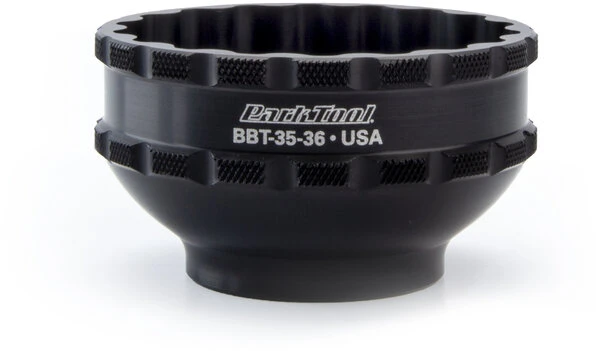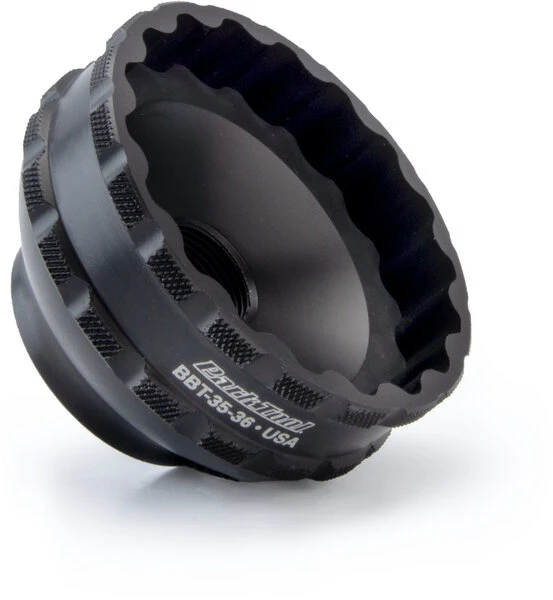 A precision CNC-machined aluminum tool for the installation and removal of select threaded bottom brackets with 36-notch tool fittings, including Praxis Works M35 bottom brackets. Manufactured in-house by Park Tool, anodized for easy identification and featuring a ratchet/torque wrench-compatible 3/8″ drive.