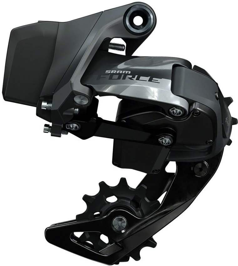 One rear derailleur to rule them all. The SRAM Force eTap AXS rear derailleur is designed for both 1x and 2x systems. It capitalizes on X-Range gearing technology for enhanced range and chain management and features larger pulleys for improved durability and efficiency. Strong, smooth, quiet and AXS enabled.