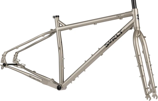 – Full-length Surly Trip Guide housing line guides for derailleurs and brakes; two sets of bottle cage mounts; upper seatstay threaded barrels, mid- and low-blade fully threaded through-blade fork eyelets; threaded holes for racks, fenders and trailer mounting nuts; Rohloff OEM2 axle plate mounting slot