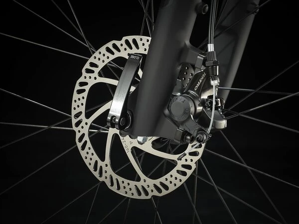 A lightweight aluminum frame, a suspension fork with enough travel to take the edge off in rough terrain, a reliable drivetrain with 16 speeds and a wide range of gearing so you’re never pedaling too hard or too soft, all-terrain tires that are grippy yet fast-rolling, and disc brakes for all-weather stopping power.