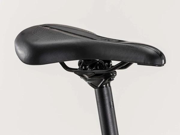 A lightweight aluminum frame with step-through geometry, a carbon fork, hydraulic disc brakes for all-weather stopping power, a Shimano drivetrain with 18 speeds and a wide range of gears for hills, a Bontrager Satellite Plus IsoZone handlebar and ergonomic grips, a Bontrager H1 Women’s saddle, extra mounts for accessories like a rack and fenders, and puncture-resistant Bontrager H2 Hard-case Lite tires.