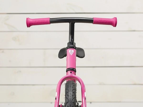 Kickster has a lightweight aluminum frame with a super-easy stepthrough geometry that’s perfectly designed for short legs. It’s built with 12″ wheels, a handle on the saddle so you can help your little one along, and a steering limiter so kids can’t turn the front wheel all the way around or turn too quickly.
